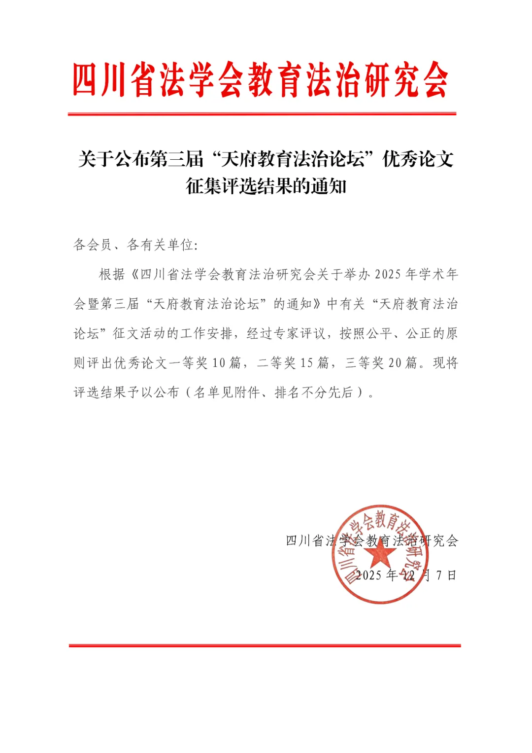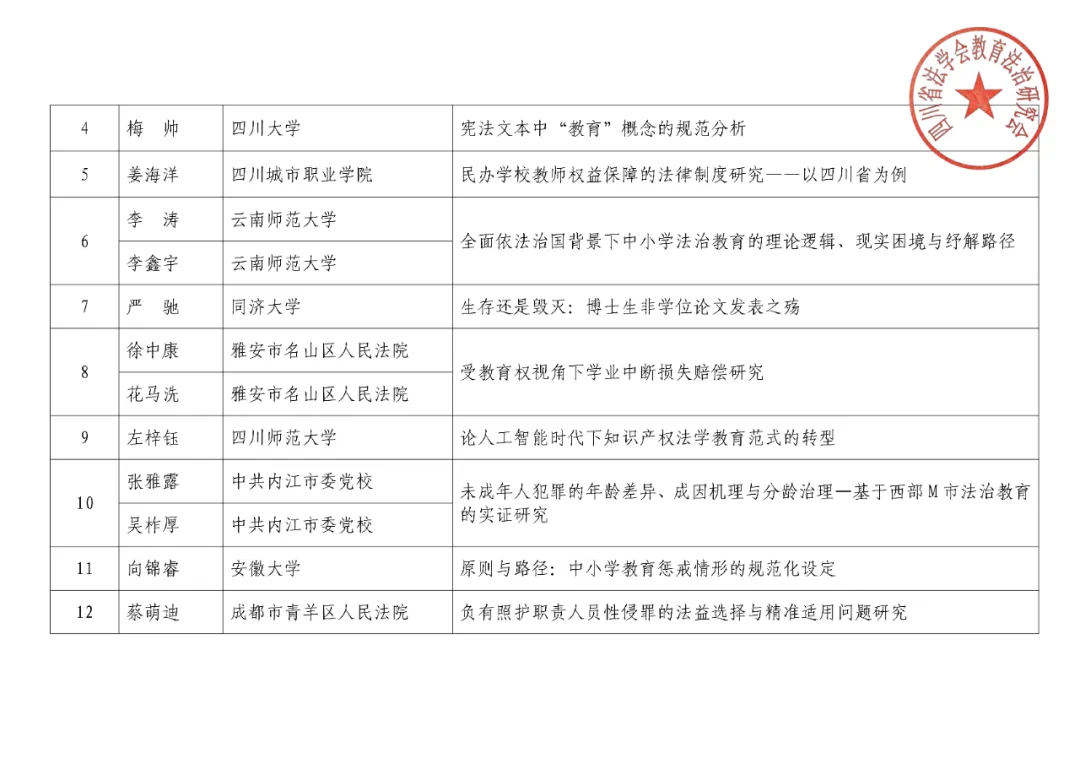 为深入推进教育法治理论与实践创新,12月7日,四川省法学会教育法治研究会2025年度学术年会暨第三届天府教育法治论坛在成都师范学院举办。本次论坛以“面向‘十五五’的教育法治建设”为主题,汇聚全省学界、实务界精英共同探讨行业重点难点问题。经专家评议,我校教师张雅露、吴柞厚所作《未成年人犯罪的年龄差异、成因机理与分龄治理——基于西部M市法治教育的实证研究》,凭借扎实的实证分析与创新的治理思路,荣获论坛优秀论文二等奖。