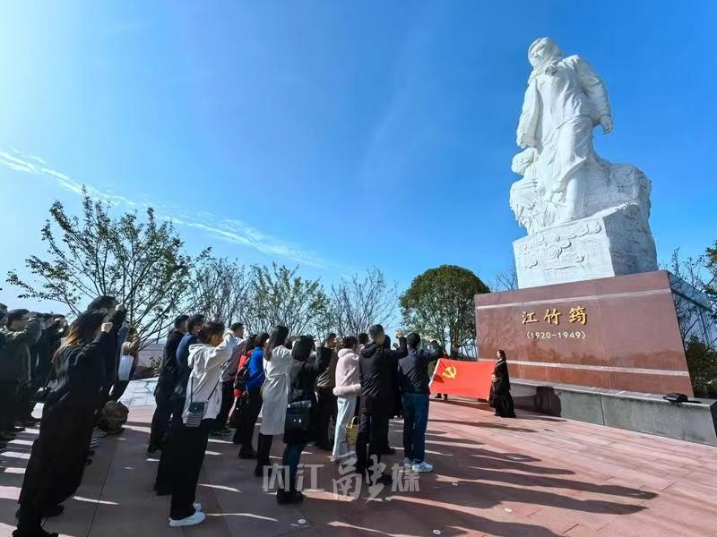 在江姐故里,全体学员一行先后参观了江姐纪念馆和江姐故居,一张张泛黄的历史图片、一件件承载革命历史的实物,诉说着江姐的革命事迹和“坚贞不屈,永不叛党”的革命精神,不禁令人肃然起敬。参观完陈列馆,学员们在江竹筠的雕塑面前重温了入党誓词。